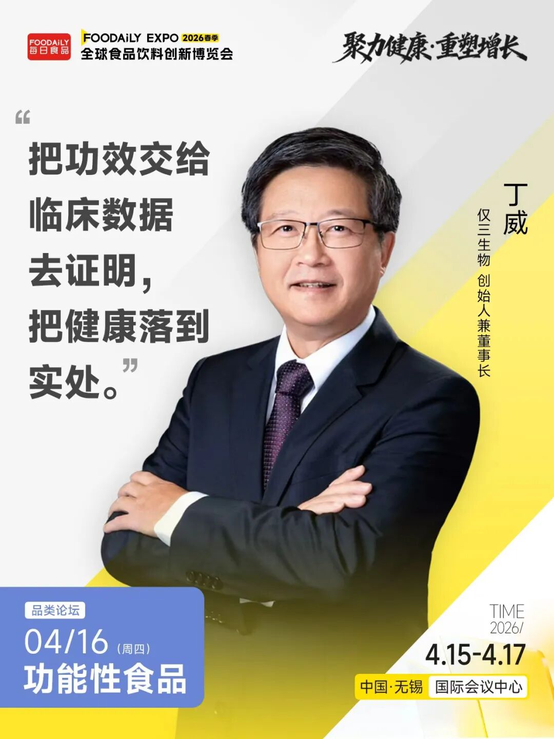 4月16日,2026 Foodaily創新博覽會「功能性食品」品pin類lei論lun壇tan上shang,僅jin三san生sheng物wu創chuang始shi人ren兼jian董dong事shi長chang丁ding威wei還hai將jiang帶dai來lai重zhong磅bang實shi戰zhan分fen享xiang,聚ju焦jiao麥mai角jiao硫liu因yin產chan業ye發fa展zhan的de關guan鍵jian拐guai點dian,深shen度du解jie讀du如ru何he以yi紮zha實shi的de科ke學xue數shu據ju,支zhi撐cheng其qi在zai具ju體ti場chang景jing下xia的de功gong效xiao宣xuan稱cheng,打da造zao差cha異yi化hua的de產chan品pin優you勢shi與yu可ke落luo地di的de解jie決jue方fang案an。