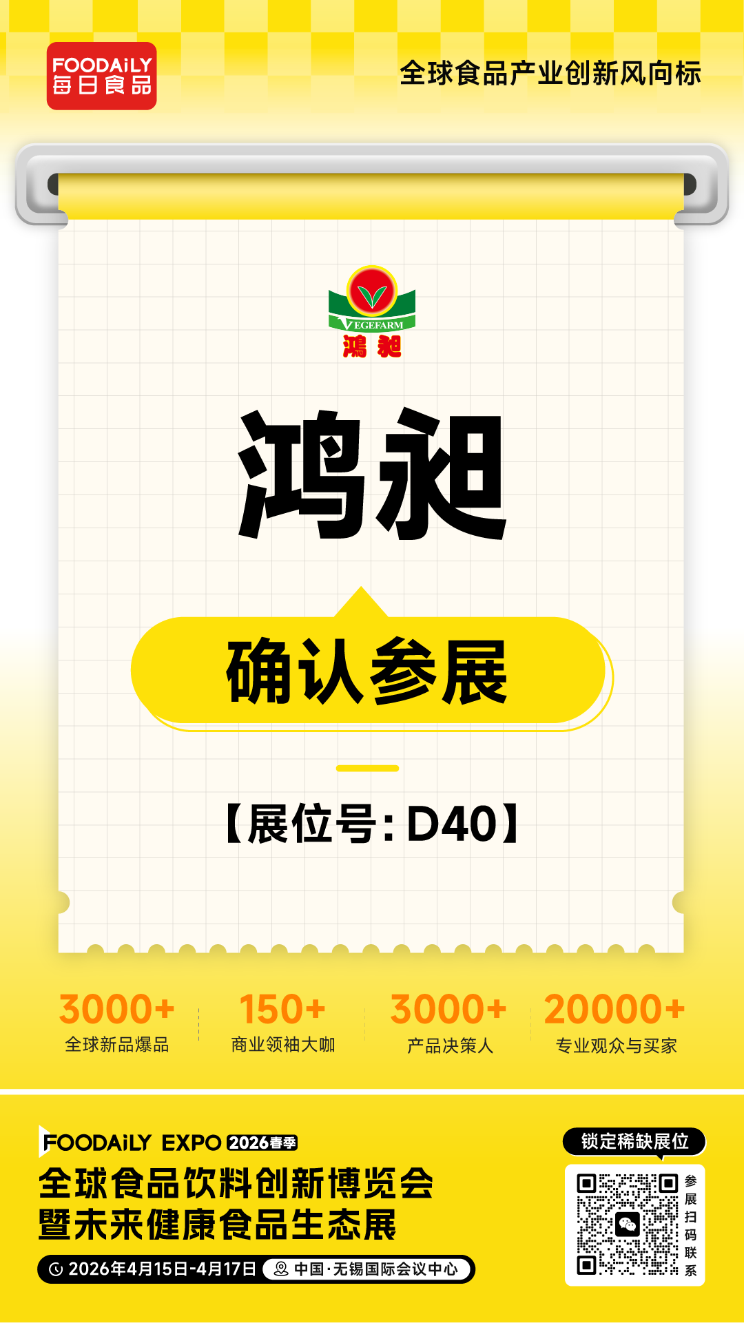 2026 Foodaily創新博覽會,鴻昶將攜旗下明星產品亮相於無錫國際會議中心,D40展位,邀各界夥伴共探素食產業創新新趨勢。