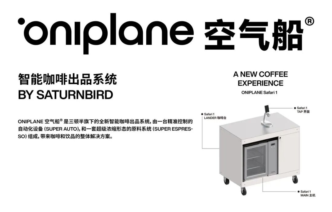 oniplane空氣船® 創新智能出品設備 Safari 1,可實現一鍵出品,20秒即可完成一杯飲品,無需專業咖啡師操作,帶來高效、便捷且穩定的出品體驗。