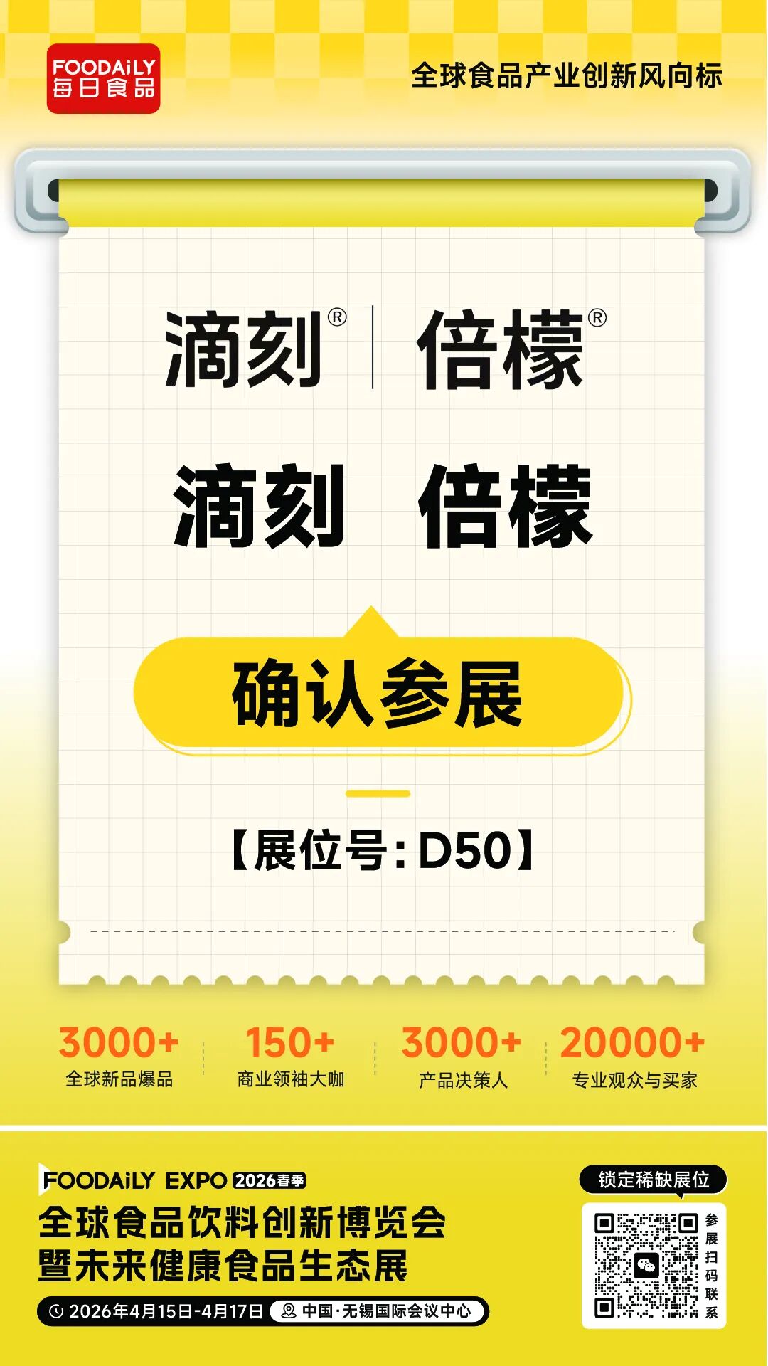 2026 Foodaily創新博覽會,倍檬、滴刻將攜旗下明星產品亮相無錫國際會議中心,D50展位,邀業界同仁共探健康飲品創新。