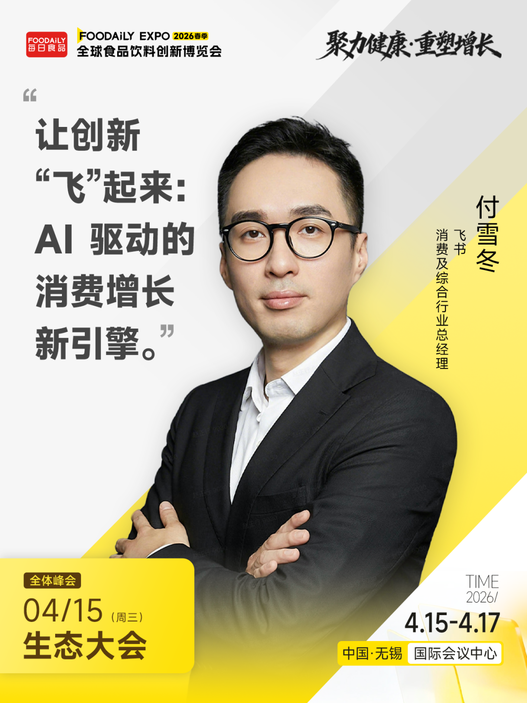 此外,4月15日,在2026 Foodaily創新博覽會的【生態大會】上,飛書消費及綜合行業總經理付雪冬將聚焦AI驅動的消費增長新引擎,深度解讀消費者信任重構、渠道碎片化與供應鏈不確定下的品牌增長邏輯,以真實一線案例拆解組織創新與協同機製,共探以AI構建係統創新飛輪、實現可持續增長的新路徑。