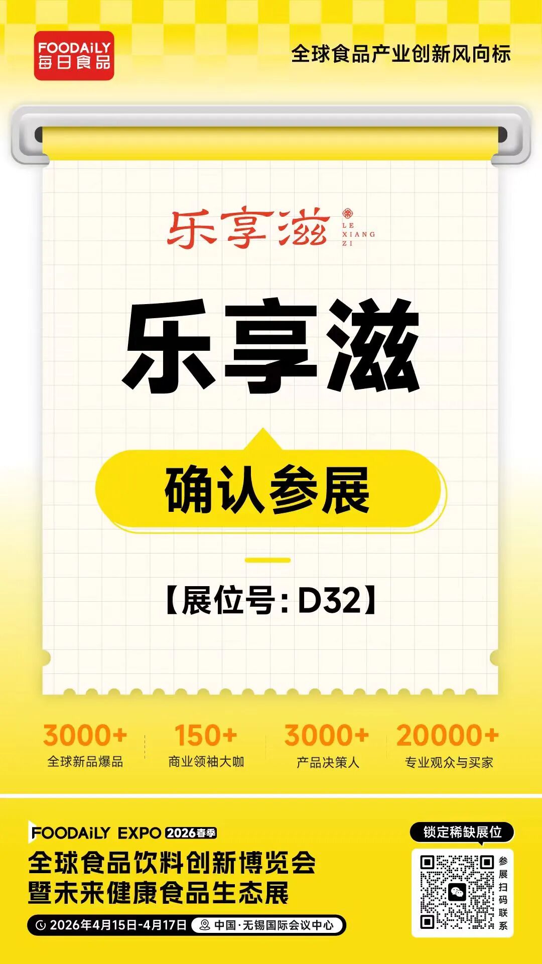 2026 Foodaily創新博覽會,樂享滋將攜旗下明星產品亮相於無錫國際會議中心,D32展位,邀各界夥伴共探新中式輕養零食創新新趨勢。