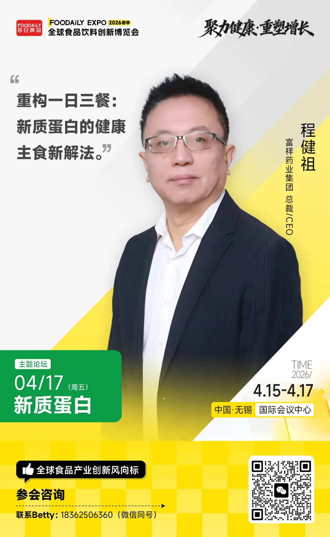 4月17日,在2026 Foodaily創新博覽會的「新質蛋白」主題論壇中,富祥藥業集團總裁/CEO程cheng健jian祖zu還hai將jiang帶dai來lai重zhong磅bang實shi戰zhan分fen享xiang,深shen度du解jie讀du新xin質zhi蛋dan白bai如ru何he通tong過guo本ben土tu化hua產chan品pin創chuang新xin與yu產chan業ye鏈lian協xie同tong融rong入ru日ri常chang飲yin食shi體ti係xi,與yu行xing業ye同tong仁ren共gong探tan新xin質zhi蛋dan白bai走zou向xiang規gui模mo化hua消xiao費fei的de可ke持chi續xu增zeng長chang路lu徑jing。