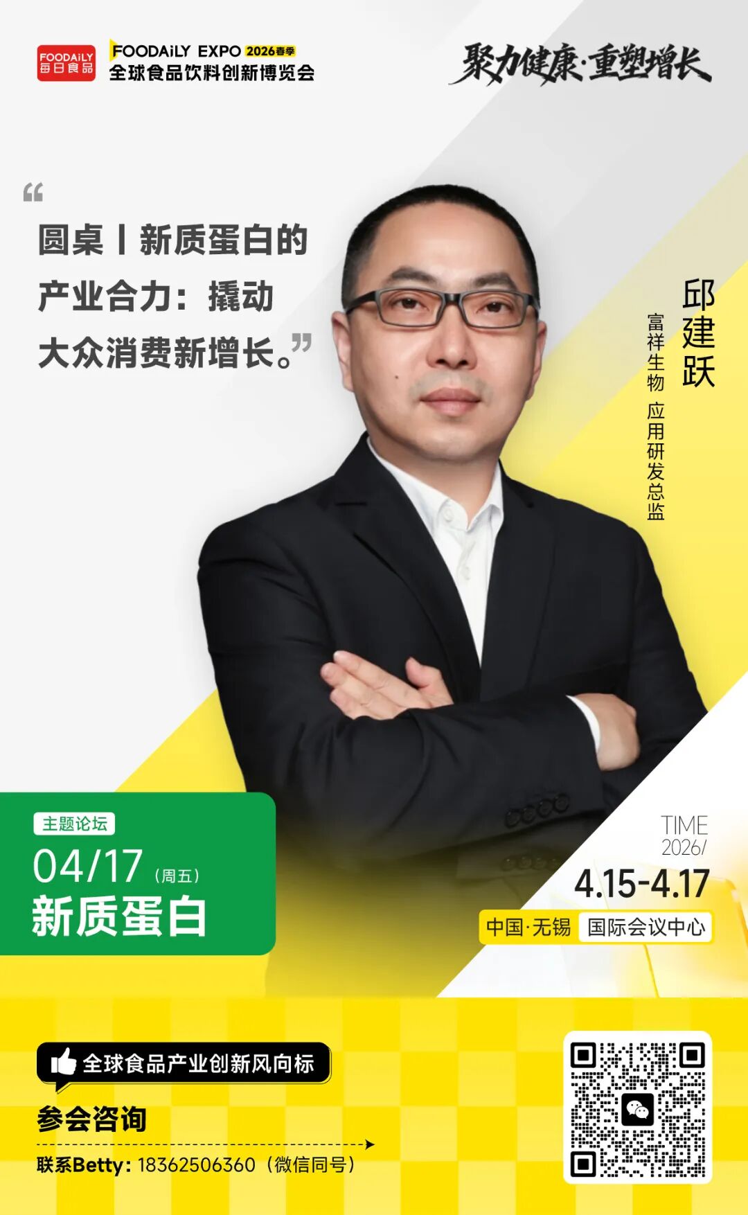 此外,富祥生物應用研發總監邱建躍也將參與論壇圓桌討論環節,圍繞口味接受度、成本下探、渠道滲透與消費者認知鴻溝等現實挑戰,圍繞口味接受度、成本下探、渠道滲透與消費者認知鴻溝等現實挑戰,與業界同仁共同探討新質蛋白在“好吃”(感官體驗)、“好用”(功能價值)與“好賣”(商業效率)之間的平衡之道。