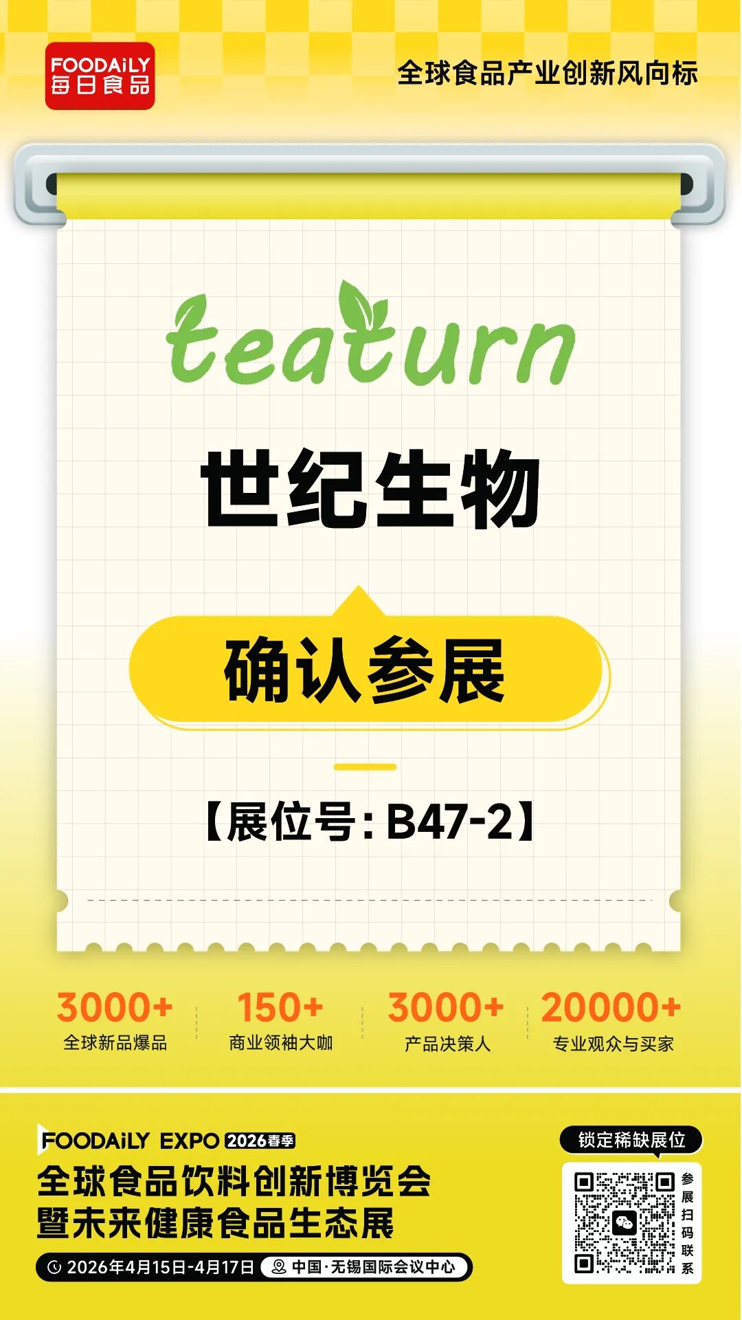 2026 Foodaily創新博覽會,世紀生物將攜旗下茶功能性成分產品矩陣亮相無錫國際會議中心,B47-2展位,邀業界夥伴共探天然茶品創新,共築茶健康產業新未來!