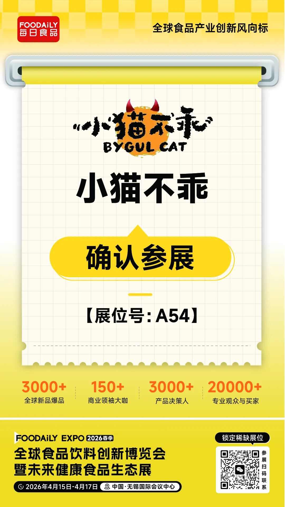 2026 Foodaily創新博覽會,小貓不乖將攜旗下創新產品亮相無錫國際會議中心,A54展位,邀各界夥伴共探休閑食品飲品創新商機。