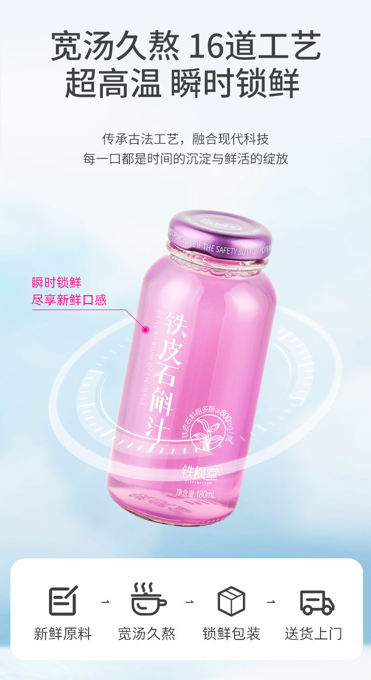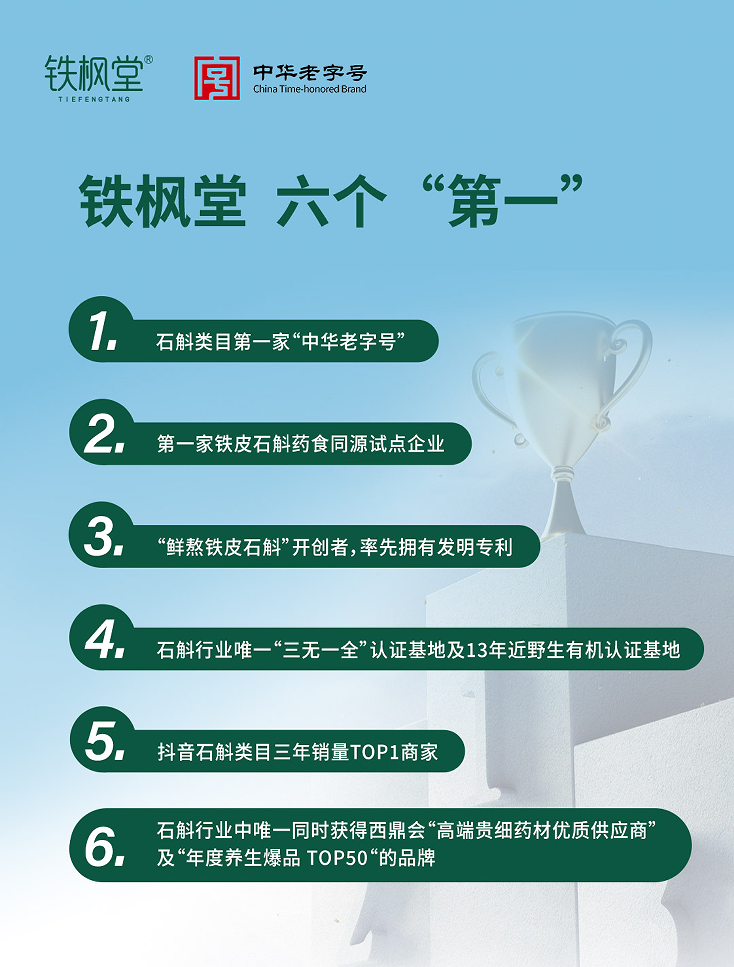 公司簡介:鐵楓堂是石斛類目中唯一的“中華老字號”品牌 。公司專注於鐵皮石斛行業,現已發展成為集品種選育、栽培種植、生產加工、研發銷售、文化旅遊於一體的全產業鏈現代科技農業企業和生物醫藥企業,總投資約10個億。開創“鮮熬鐵皮石斛”新品類,打造即飲、輕滋補、浸膏三大係列。 浙江鐵楓堂健康科技有限公司攜手浙江省農科院和各大高校,深入開展鐵皮石斛的全麵解析工作,及其精深加工;在雁蕩山鐵皮石斛科技園建立行業首個“鐵皮石斛研究院”。鐵楓堂秉持陽光工廠理念,建立智能化工廠,引入MS駕駛倉管理係統,實現全流程機械手操作,生產更先進,品質更有保障。