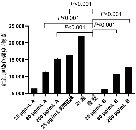 在Phytozing®番通寧®水溶性番茄濃縮粉預防斑馬魚血小板聚集性血栓形成的作用研究中,Phytozing®對斑馬魚心髒紅細胞染色強度(圖1)和血流速度(圖2)的影響,推測其有顯著的抗血栓活性,尤其是在濃度為 80 和 250 mg/mL時,其中A B不同批次的Phytozing®在本研究中的表現相差較小,對實驗結果的影響無顯著性差異。相較於阿司匹林等化學藥物,從天然番茄中提取的富含ACs的Phytozing®不僅具有良好的的潛在抗血栓功能,且急性經口毒性判定為無毒(對雌、雄性KM小鼠的急性經口毒性LDs0>10000mg/kg體重),這為其作為潛在抗血栓劑的開發提供了新的思路。